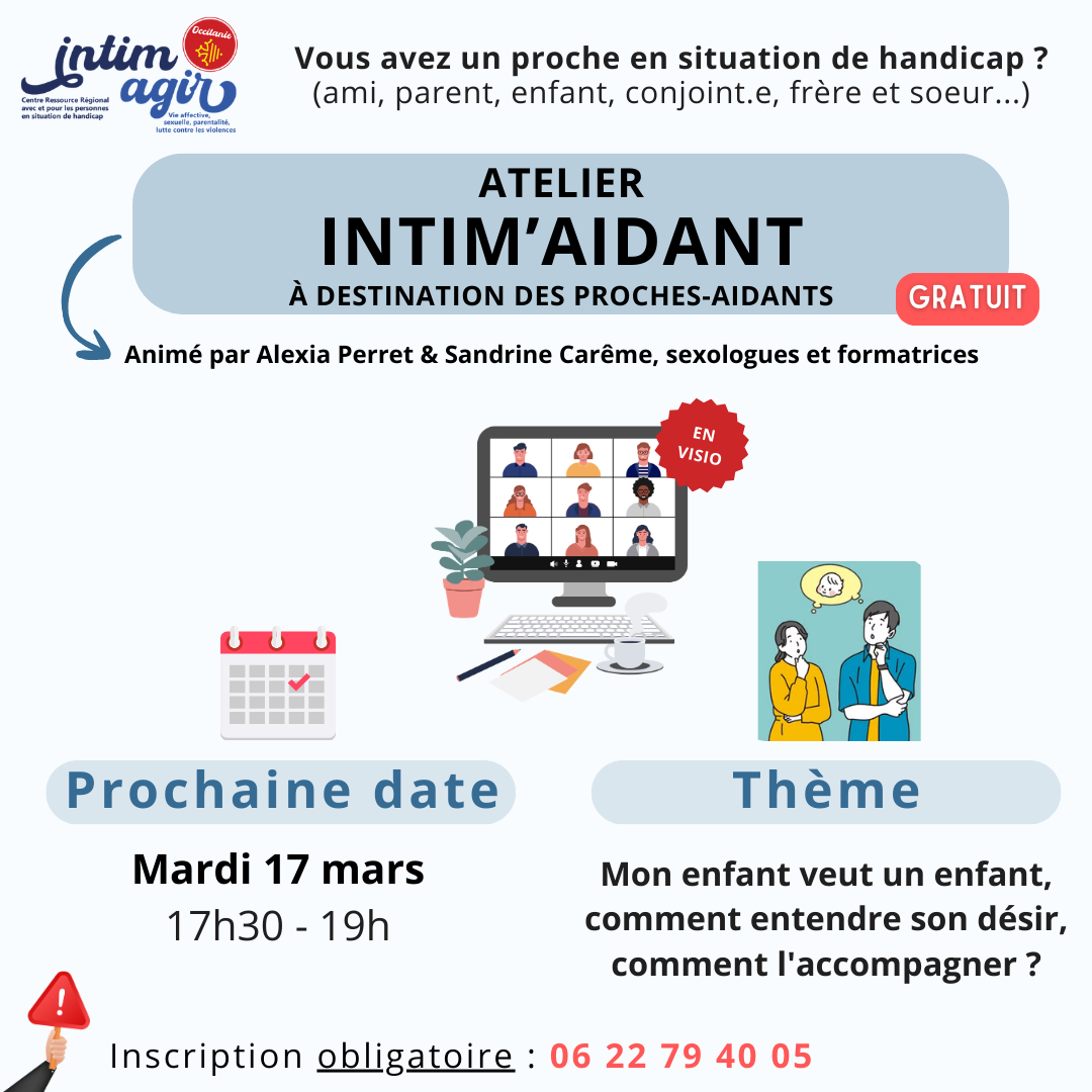 Cet atelier animé par Sandrine Carême propose un espace d’échange pour les proches-aidants confrontés au désir d’enfant de leur proche. Un temps pour mettre en mots ses questionnements, partager ses préoccupations et réfléchir ensemble à une posture d’accompagnement ajustée. 💡