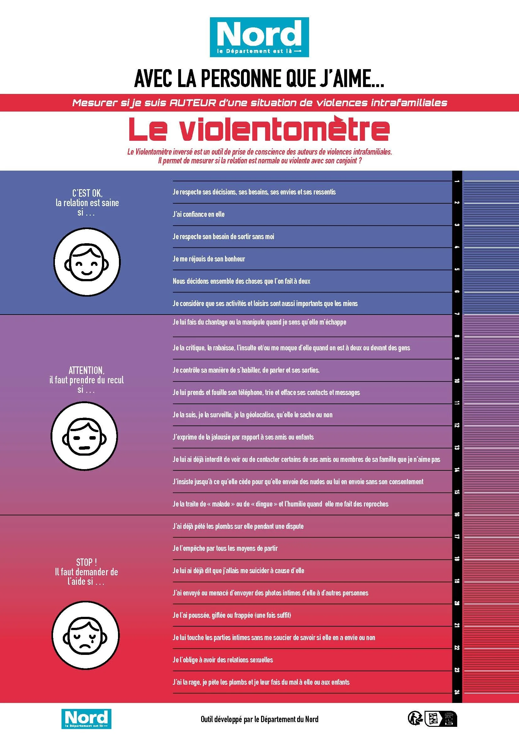 Ce violentomètre inversé est un outil de sensibilisation destiné à aider les personnes à repérer leurs propres comportements dans une relation.