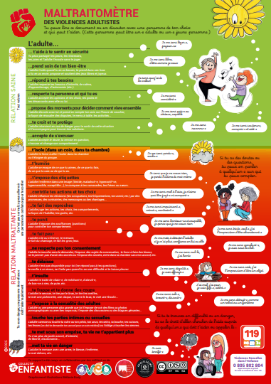 Inspiré du violentomètre, il distingue les comportements respectueux des situations de maltraitance, en s’appuyant sur des exemples concrets et des émotions ressenties. Il permet d’identifier les violences (psychologiques, physiques, sexuelles) et rappelle que les enfants ont des droits et doivent être protégés.