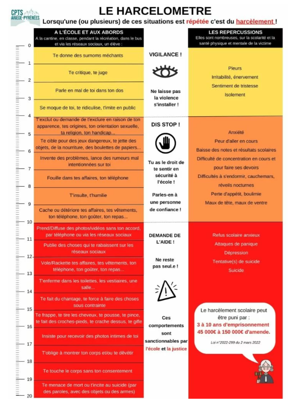 Inspiré du violentomètre, cette échelle colorée du vert au rouge, répertorie les comportements et permet de connaître sa situation, de déterminer si une personne est victime de harcèlement.